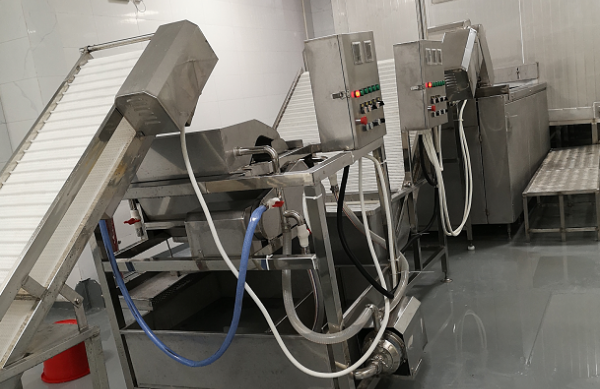 隧道式連續(xù)速凍機(jī)主要由隧道體、蒸發(fā)器、風(fēng)機(jī),料架或不銹鋼傳動(dòng)網(wǎng)帶等組成。被速凍的物料放在料架的各層篩盤中或網(wǎng)帶上通過(guò)隧道,空氣通過(guò)蒸發(fā)器降溫,然后送入隧道中,穿流于物料之間使其速凍,凍結(jié)物料的作業(yè)方法與隧道式逆流干燥設(shè)備相同;冷風(fēng)與物料在隧道內(nèi)的流動(dòng)方向相反,第一、二級(jí)傳動(dòng)網(wǎng)帶的運(yùn)輸速度可以分別控制,冷風(fēng)分別吹到網(wǎng)帶上,穿過(guò)物料層,再經(jīng)蒸發(fā)器與風(fēng)機(jī),循環(huán)使用。物料先通過(guò)第一級(jí)網(wǎng)帶,運(yùn)行較快,料層較薄,使表面凍結(jié);然后轉(zhuǎn)入第二級(jí)網(wǎng)帶,運(yùn)行較慢,料層較厚,使整個(gè)物料全部?jī)鼋Y(jié),得到單粒速凍產(chǎn)品,這種速凍機(jī)的特點(diǎn)是可以凍結(jié)產(chǎn)品的范圍廣,冷凍效率較高,沖霜迅速,清洗方便。